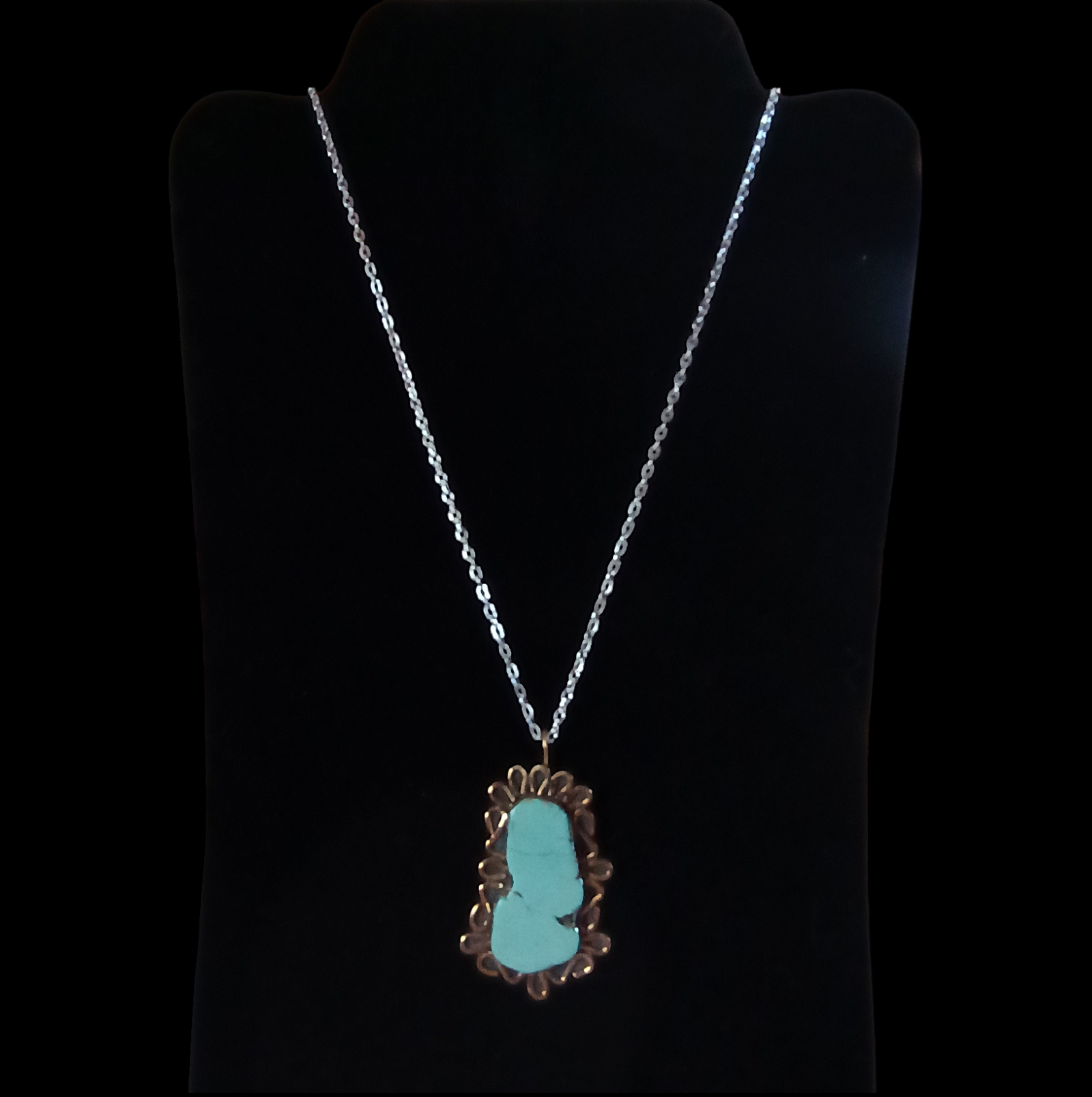 Turquoise oxydized pendant with Navajo wire edge design. Includes 20in silver chain